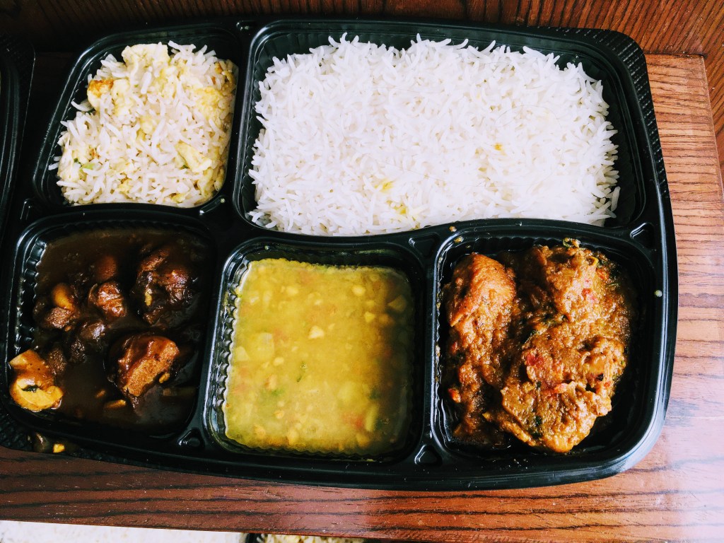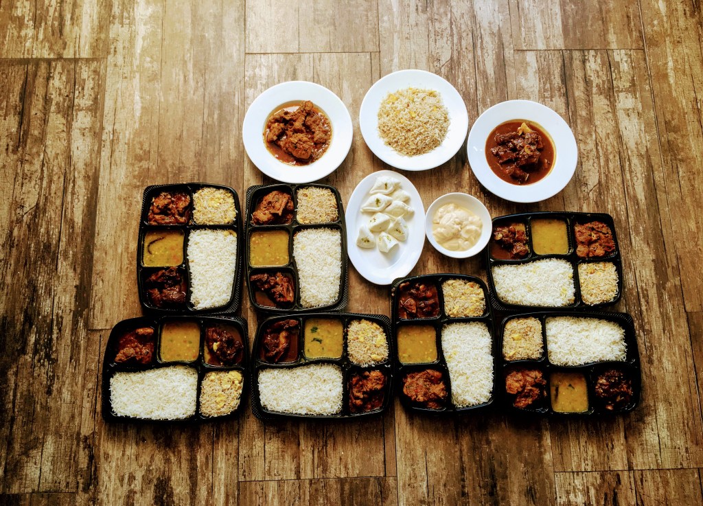 - Separate lunch boxes with Egg Fried Rice, Mutton Curry, Chicken Curry, Plain Rice and Dal.